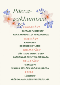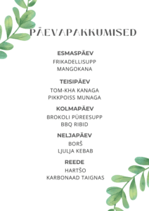 Päevapakkumised Kallid külastajad!Selle nädala päevapakkumised: Head isu! 🙂 Templikaardiga iga kümnes päevapraad tasuta!